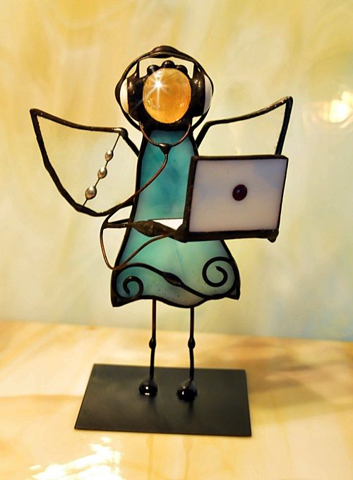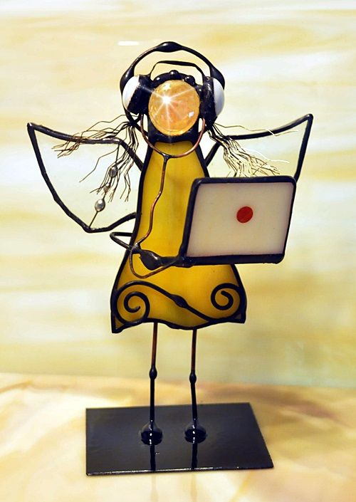 Aniołek witrażowy wykonany z wysokiej jakości szkła witrażowego spectrum (USA) i metali kolorowych (miedź, mosiądz, cyna). Wykonanie technika Tiffany. Patynowany na czarno. Wysokość aniołka 13 cm, podstawka 6 x 6 cm.