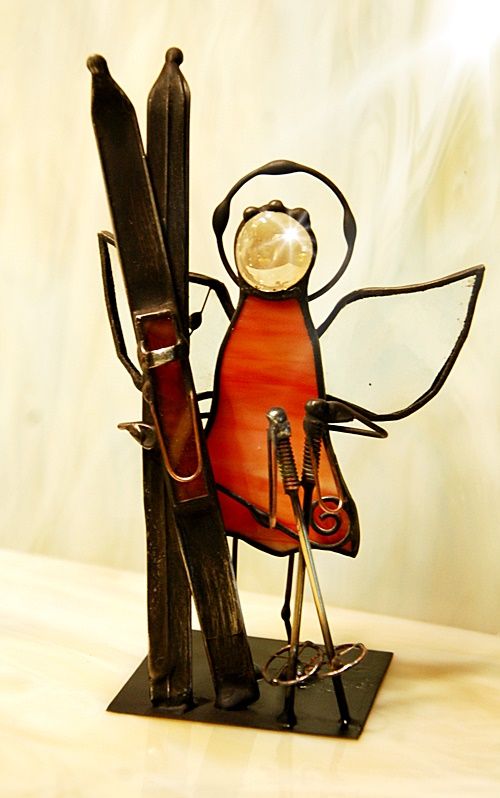 Aniołek witrażowy wykonany z wysokiej jakości szkła witrażowego spectrum (USA) i metali kolorowych (miedź, mosiądz, cyna). Wykonanie technika Tiffany. Patynowany na czarno. Wysokość aniołka 13 cm, podstawka 6 x 6 cm. Narty 15 cm.