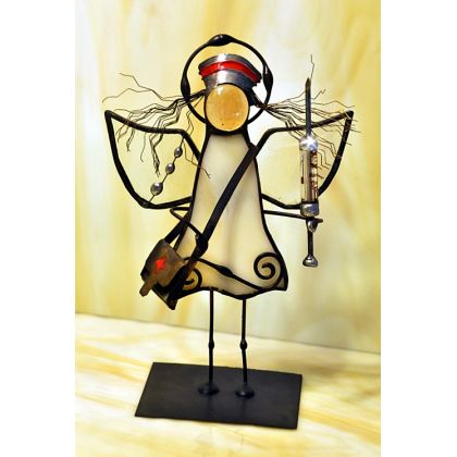Aniołek witrażowy wykonany z wysokiej jakości szkła witrażowego spectrum (USA) i metali kolorowych (miedź, mosiądz, cyna). Wykonanie technika Tiffany. Patynowany na czarno. Wysokość aniołka 13 cm, podstawka 6 x 6 cm. Możliwa wersja: pielęgniarka ze strzykawką, z sercem lub położna ze strzykawką z sercem lub dzieckiem.