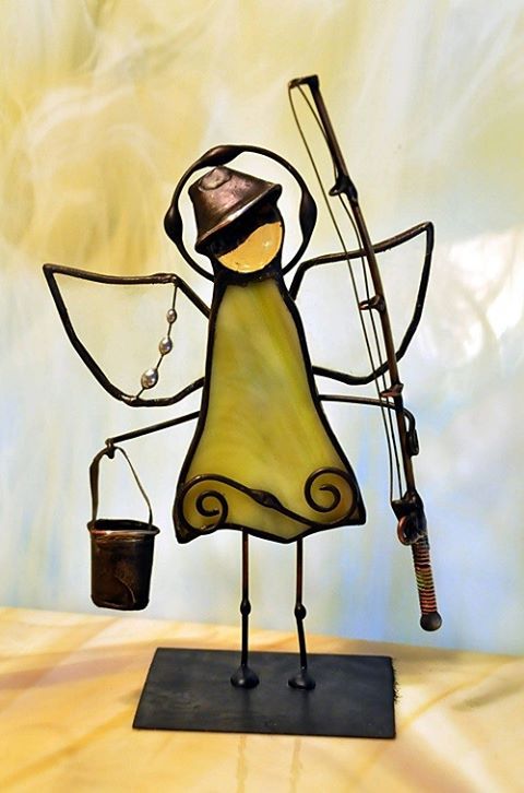 Aniołek witrażowy wędkarz, wykonany ze szkła witrażowego wysokiej jakości (specktrum) w technice Tiffany. Użyto też metali kolorowych jak: miedź, mosiądz i cyna. Patynowany na czarno. Wys. aniołka 13 cm, podstawka 6 x 6 cm.