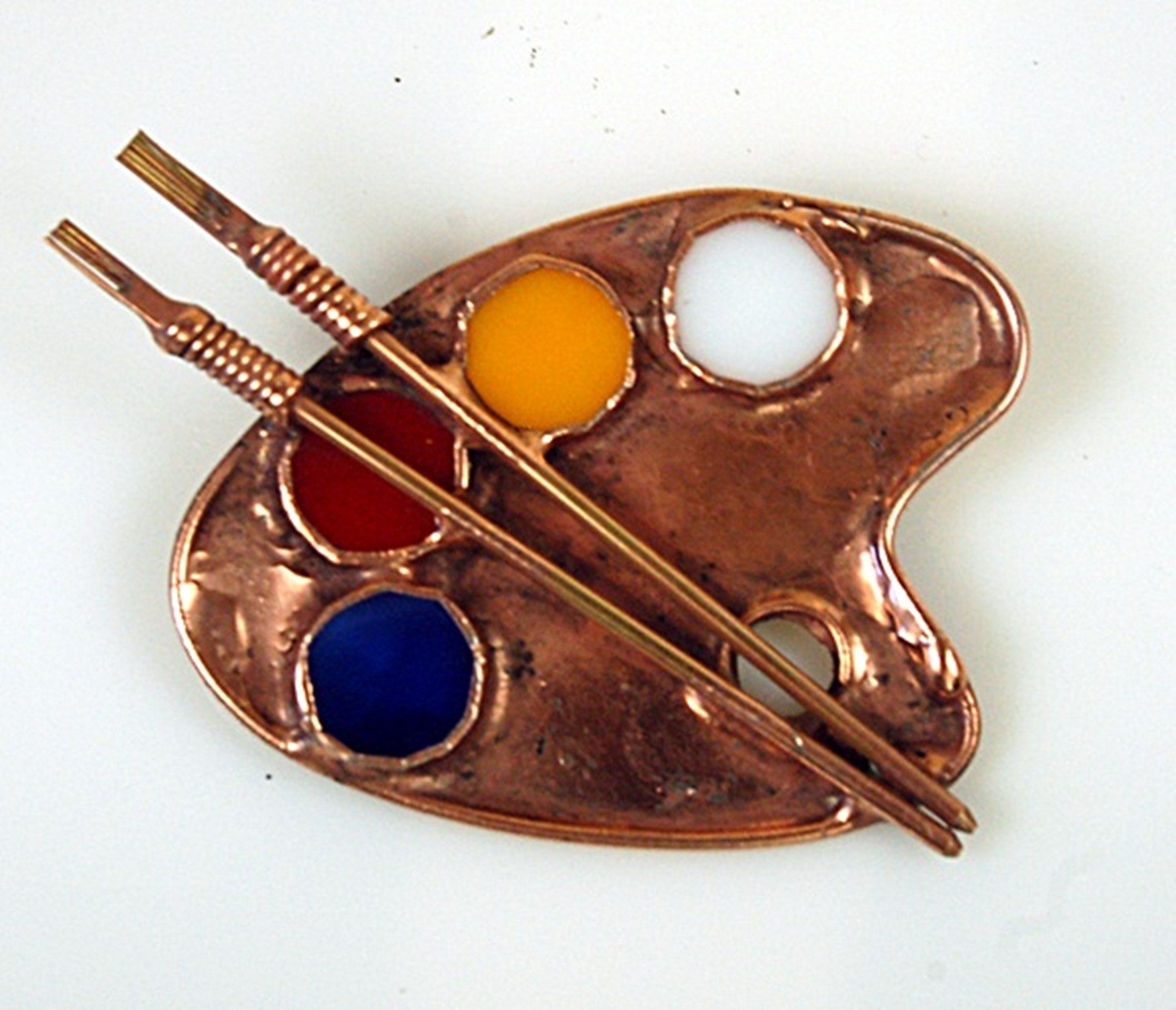 Broszka o wymiarach 5 x 7 cm wykonana z mosiądzu i miedzi. Kolorowe farbki wykonane ze szkła witrażowego. Pod spodem typowe zapięcie dla broszki typu agrafka. Pokryte patyną i lekko przetarte nadaje broszce charakter. Na prezent dla malarki lub malarza.