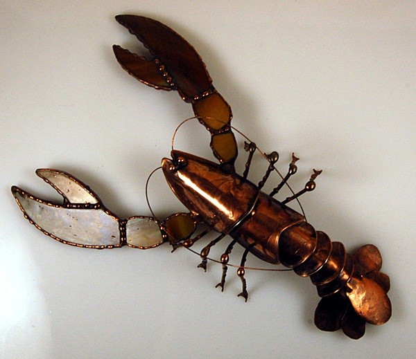Rak. Oryginalna praca wykonana z metali kolorowych i szkła witrażowego techniką Tiffany. Patynowana na miedziano. Wymiary gabarytowe: 14 x 22 cm. Tułów raka dł. ok. 15 cm. Można postawić na komodzie lub powiesić na ścianie.