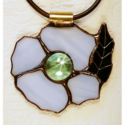 Wisior kwiatek z listkiem wykonany ze szkła witrażowego techniką Tiffany. Patynowany na czarno z przebłyskami miedzi. Wisior w komplecie z naszyjnikiem z rzemienia jubilerskiego o średnicy 2 mm i długości 50 cm z zapięciem srebrzonym karabińczyk. Możliwe różne kolory oraz rodzaj patyny: srebrna, miedziana, czarna. Wymiary wisiora: szerokość 7 cm, wysokość 6 cm.