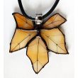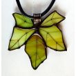 Wisior liść wykonany ze szkła witrażowego technika Tiffany. Patynowany na czarno z przebłyskami miedzi. Wisior w komplecie z naszyjnikiem z rzemienia jubilerskiego o średnicy 2 mm i długości 50 cm z zapięciem srebrzonym karabińczyk. Możliwe różne kolory uzgodnione ze sprzedawcą. Wymiary wisiora: szerokość 7 cm, wysokość 8 cm.
