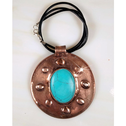 Wisior z oczkiem z kamiennego kaboszonu wykonany z blachy mosiężnej 0,2 mm. Patynowany na miedź. Wisior w komplecie z naszyjnikiem z rzemienia jubilerskiego o średnicy 2 mm i długości 50 cm z zapięciem srebrzonym karabińczyk. Wymiary wisiora: średnica 75 mm.