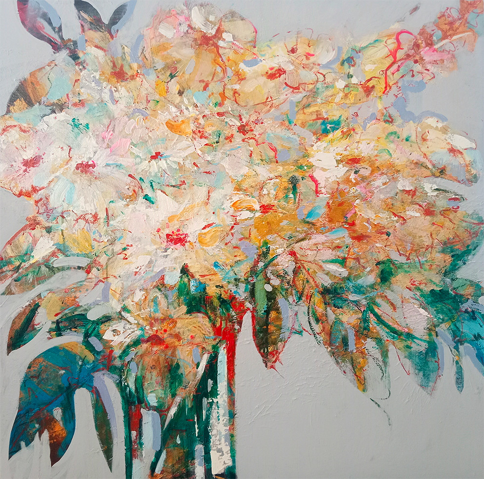 Na jasnoszarym tle wybucha ogromny bukiet jak chmura, rozlany szeroko na boki i ciężki u góry. Widać kremowe i morelowe płatki, złotawe smugi i turkusowe plamy, a między nimi nerwowe, czerwone niteczki jakby ktoś je szybciutko dopisał. Kompozycja jest gęsta, lecz nie dusi, bo farba zostawia prześwity i oddech. Pociągnięcia są grube, miejscami z impastem, miejscami rozcierane, taka mieszanka gestu i przypadkuu. Nastrój ma jednocześnie lekki i rozedrgany, jak po dobrej rozmowie. Patrząc na to czuję trochę radości, trochę chaosu, i nagle robi sie ciepło w środku, wow. Styl idzie w stronę ekspresyjnej abstrakcji, gdzie kolor gra pierwsze skrzypce, a detale tylko mrugają.