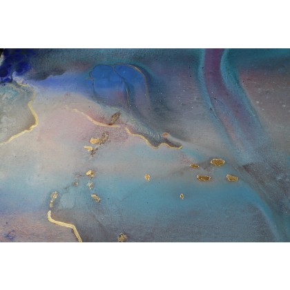 Obraz z cyklu Moje mgły malowany na płótnie 100 x 100 cm, farby akrylowe i złoty relief. Obraz werniksowany a boki zamalowane. Obraz sygnowany w lewym, dolnym rogu.