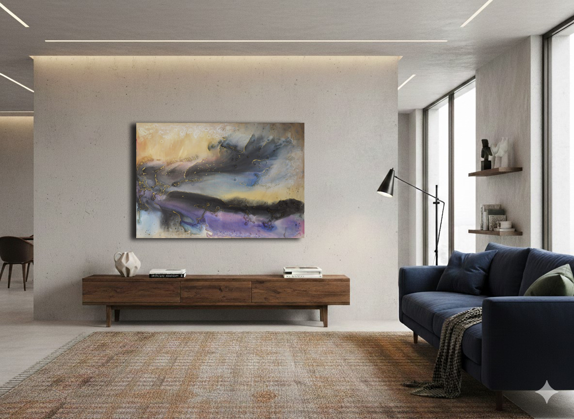 Moje mgły 54 - płótno 150 x 100 cm, akryl, boki zamalowane na czarno. Obraz można powiesić w pionie jak i w poziomie. Sygnatura z tyłu obrazu. Boki zamalowane na czarno.