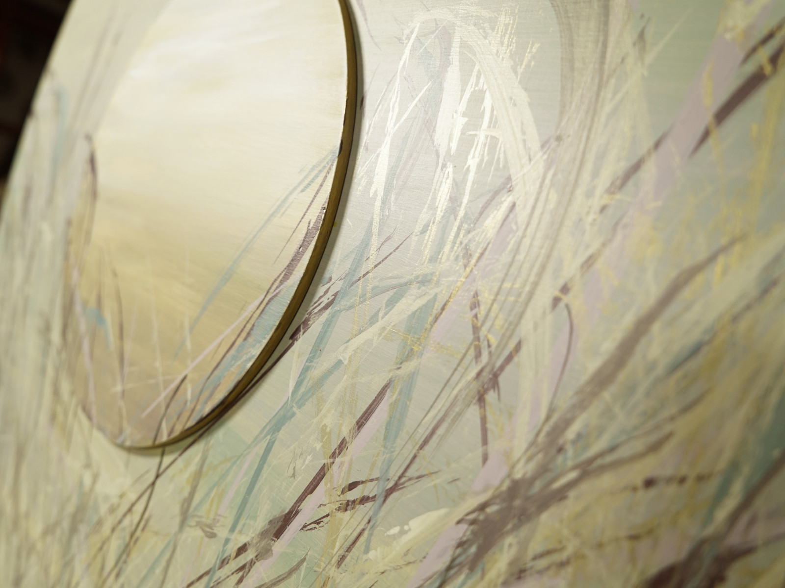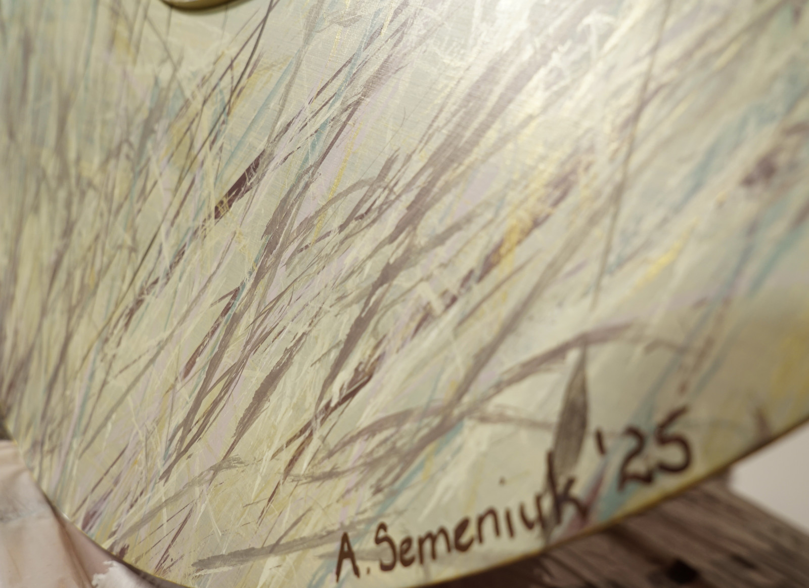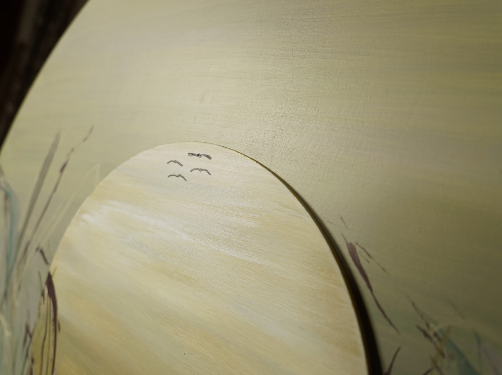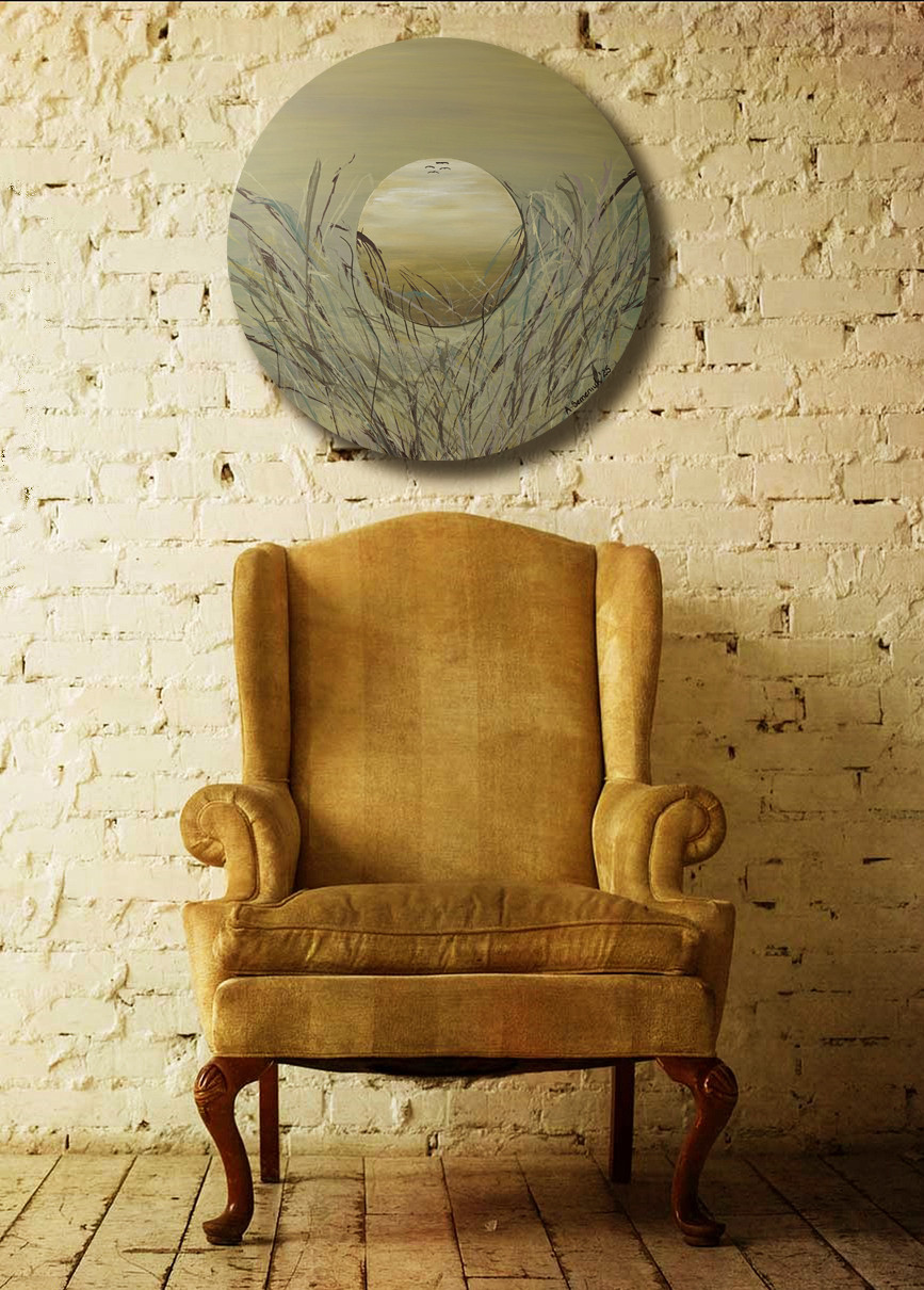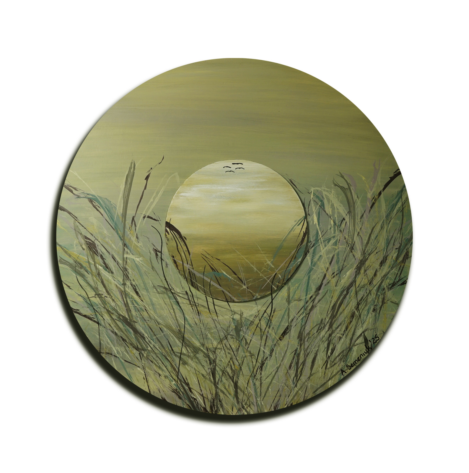 Niech szemrze...11 - obraz malowany na sklejce o grubości 6 mm, średnica 75 cm, po środku koło o średnicy 29,5 cm, farby akrylowe. Z tyłu pracy przymocowane dwie listwy dystansowe.