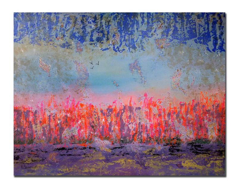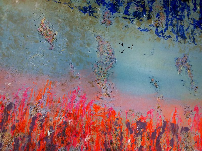 Obraz z cyklu Widok malowany na płótnie 90 x 70 cm farbami akrylowymi. Zastosowałam także grubą strukturę. Boki zamalowane. Obraz sygnowany w lewym, dolnym rogu. Uwaga - kolory mogą nieznacznie różnić się z powodu ustawień monitora.