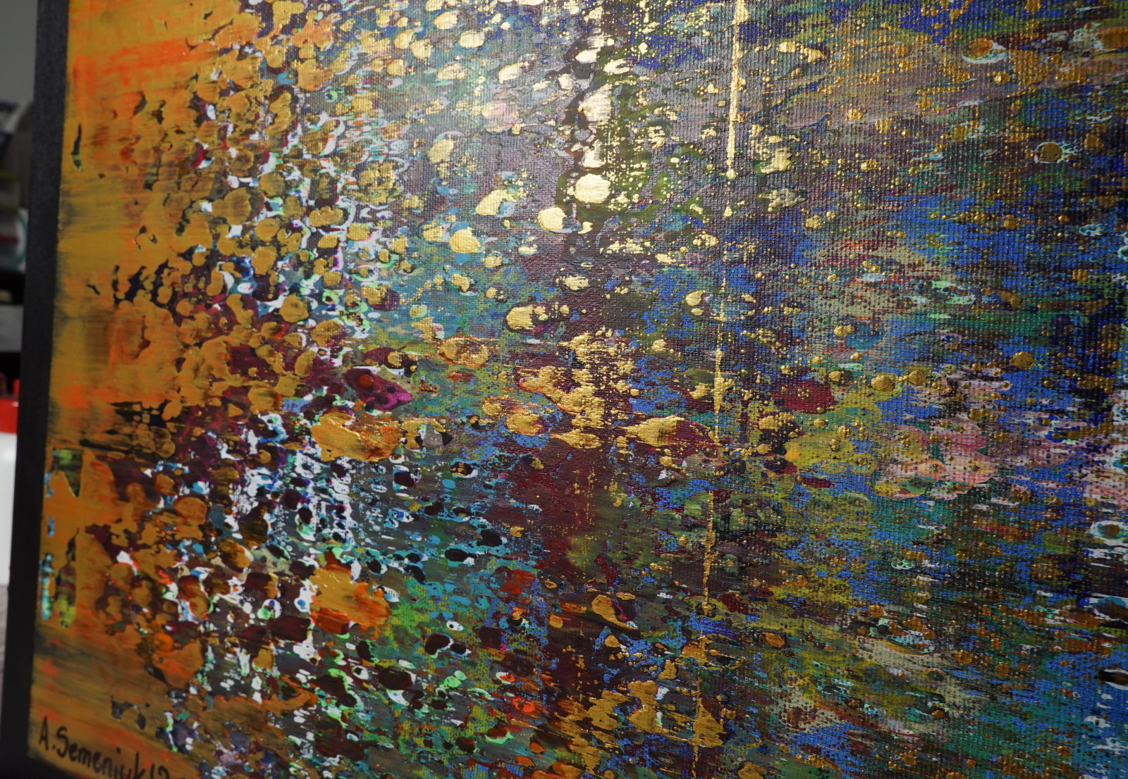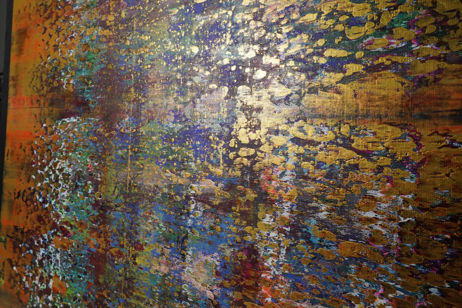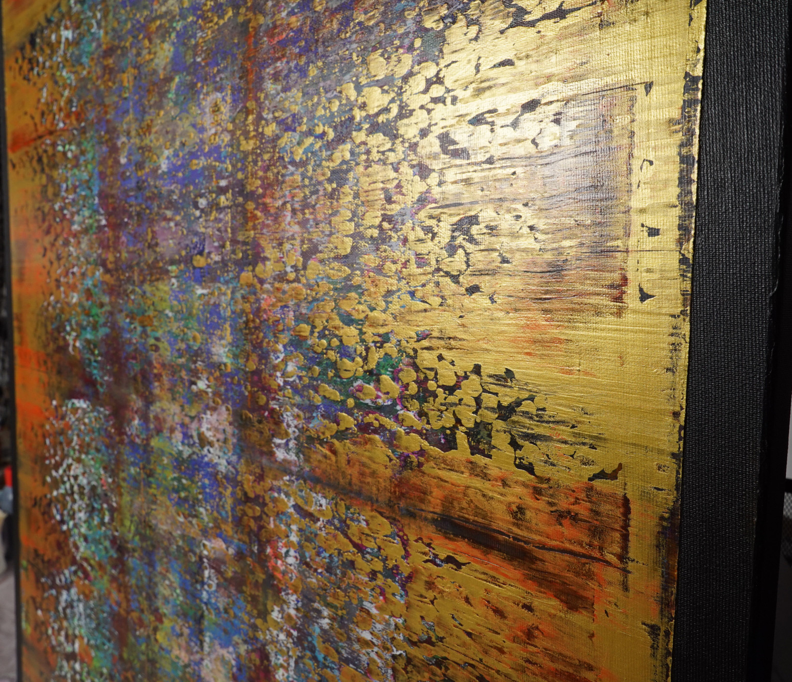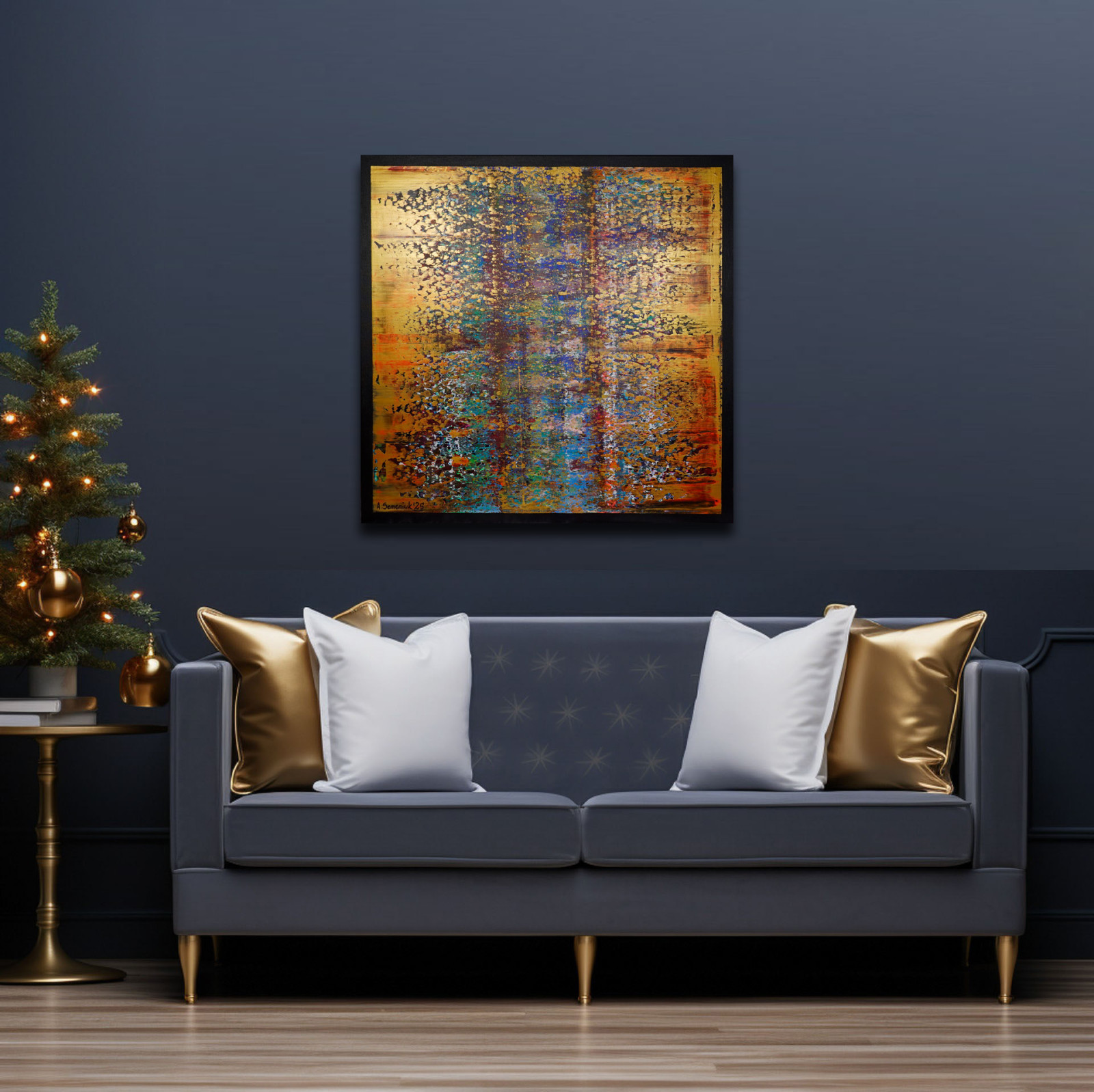 Obraz malowany na płótnie 80 x 80 cm, farby akrylowe. Boki zamalowane na czarno. Sygnatura w dolnym, prawym rogu. Praca inspirowana twórczością Gerharda Richtera.