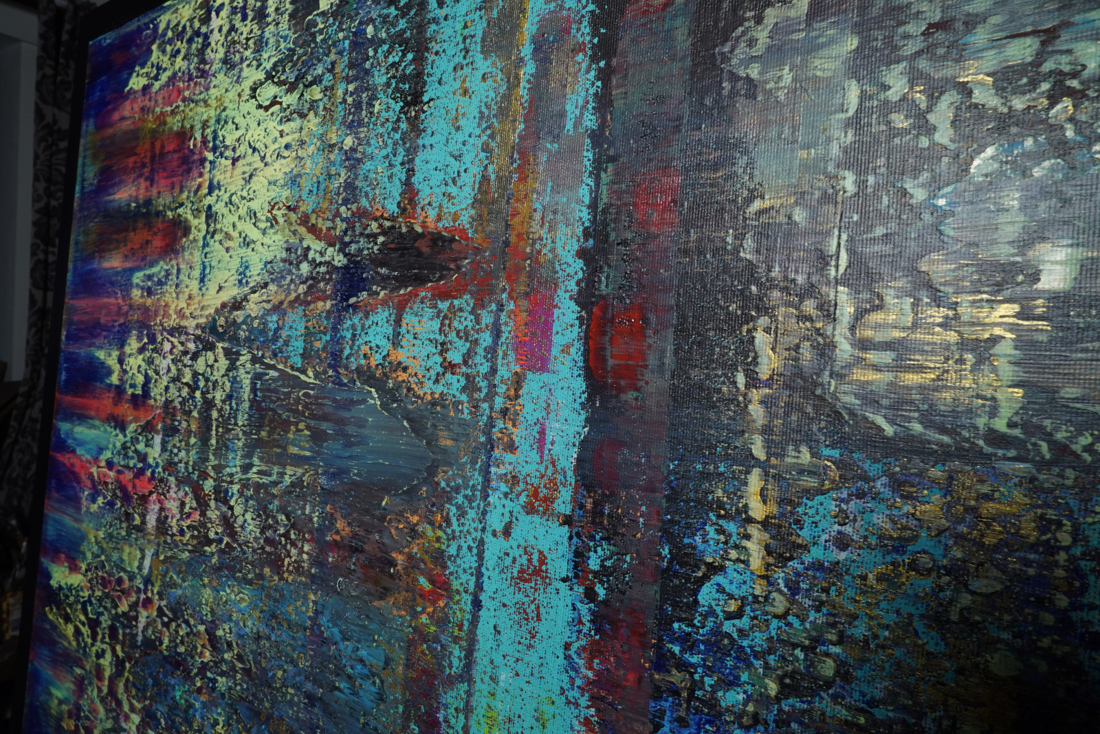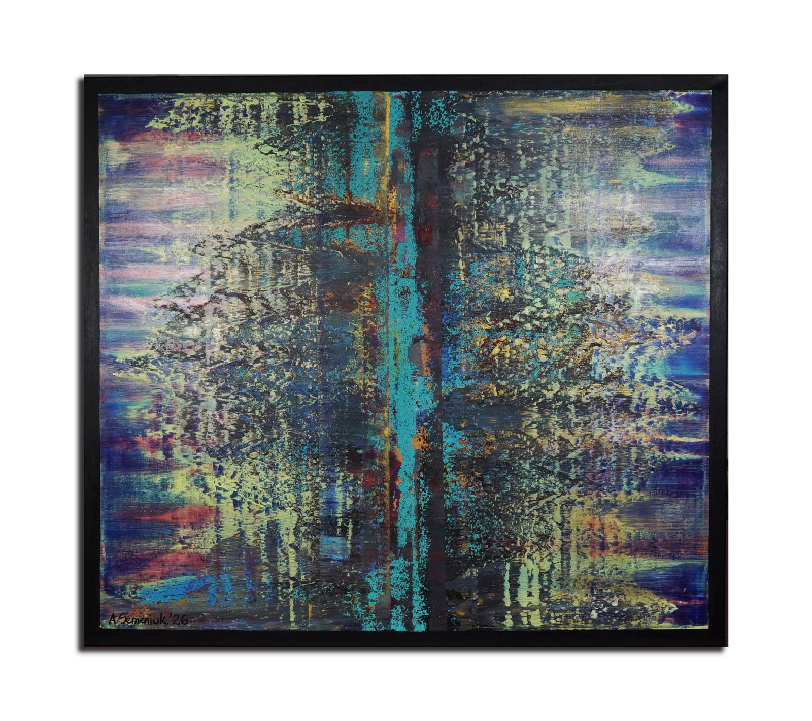 Obraz balansuje między spokojem a niepokojem. Z jednej strony chłodna kolorystyka i symetria uspokajają, z drugiej – poszarpane krawędzie i surowość wykonania sugerują erozję, upływ czasu lub cyfrowy szum. To dzieło, które nie narzuca jednej interpretacji, pozwalając odbiorcy na swobodną projekcję własnych emocji – od melancholii po zachwyt nad technologiczną estetyką.