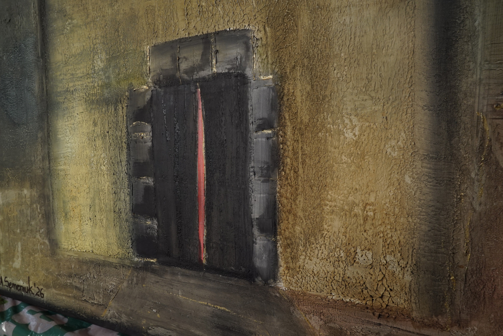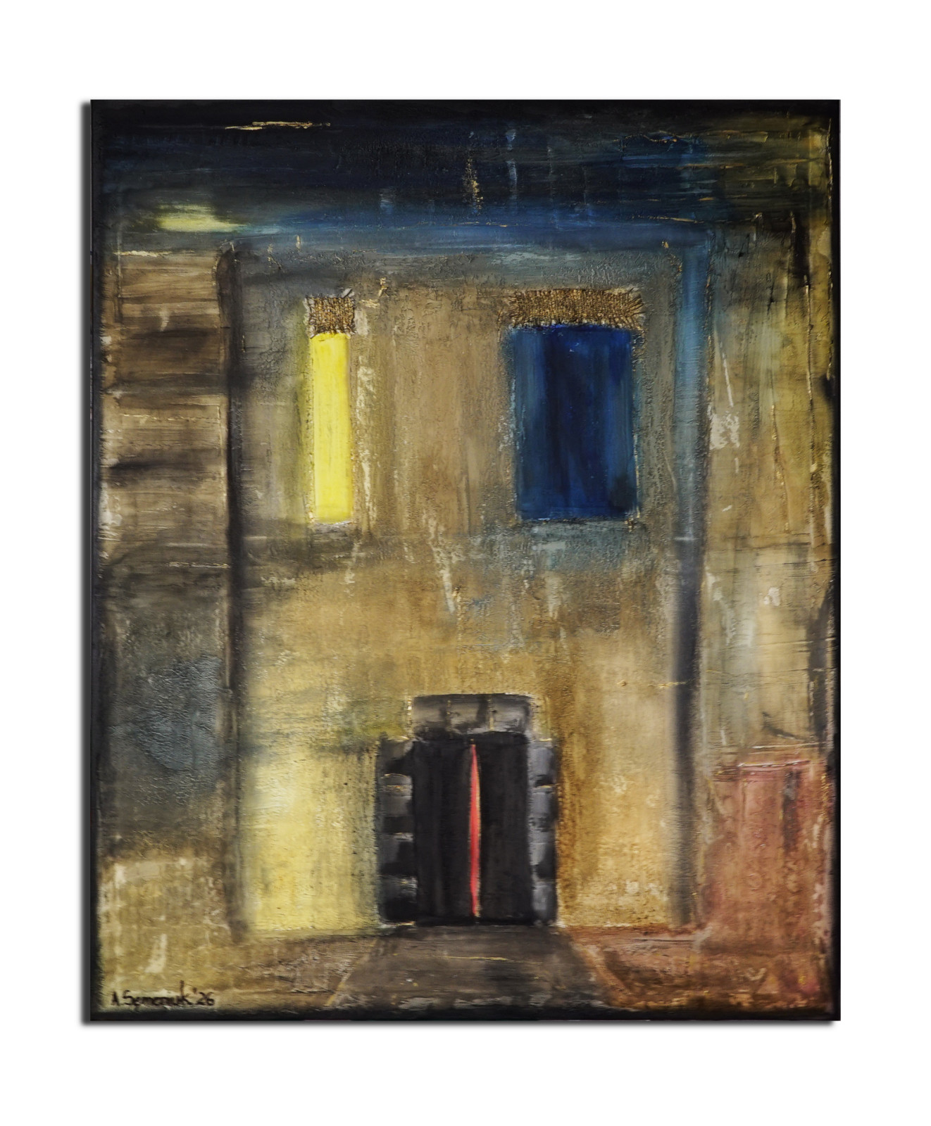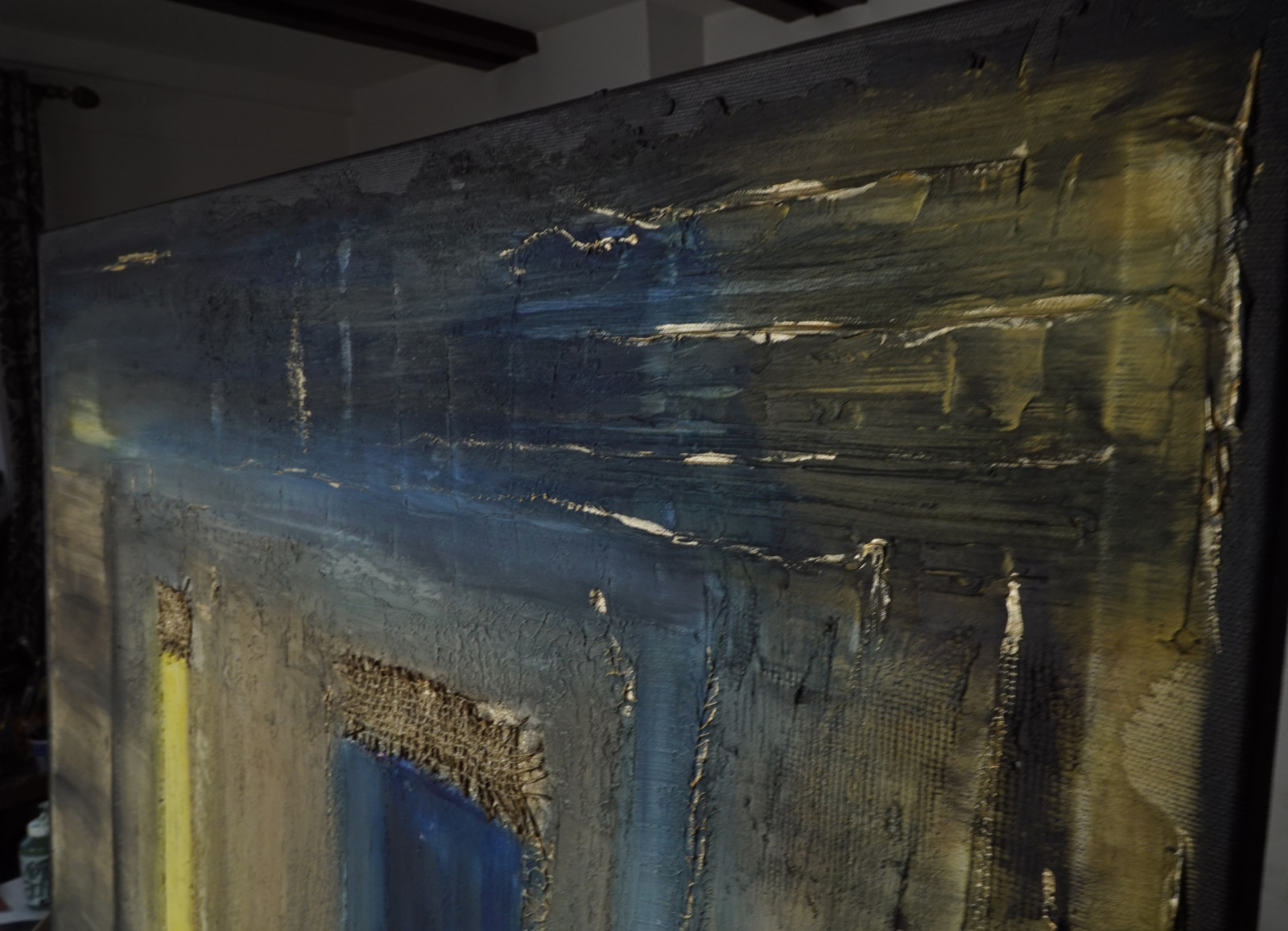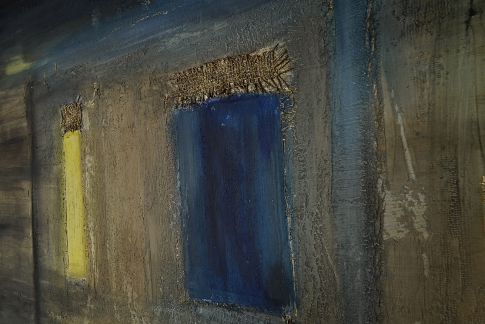 Casa española 9” - płótno 100 x 80 cm, gruba struktura, juta, akryl, bejce, werniks. Boki zamalowane na czarno.