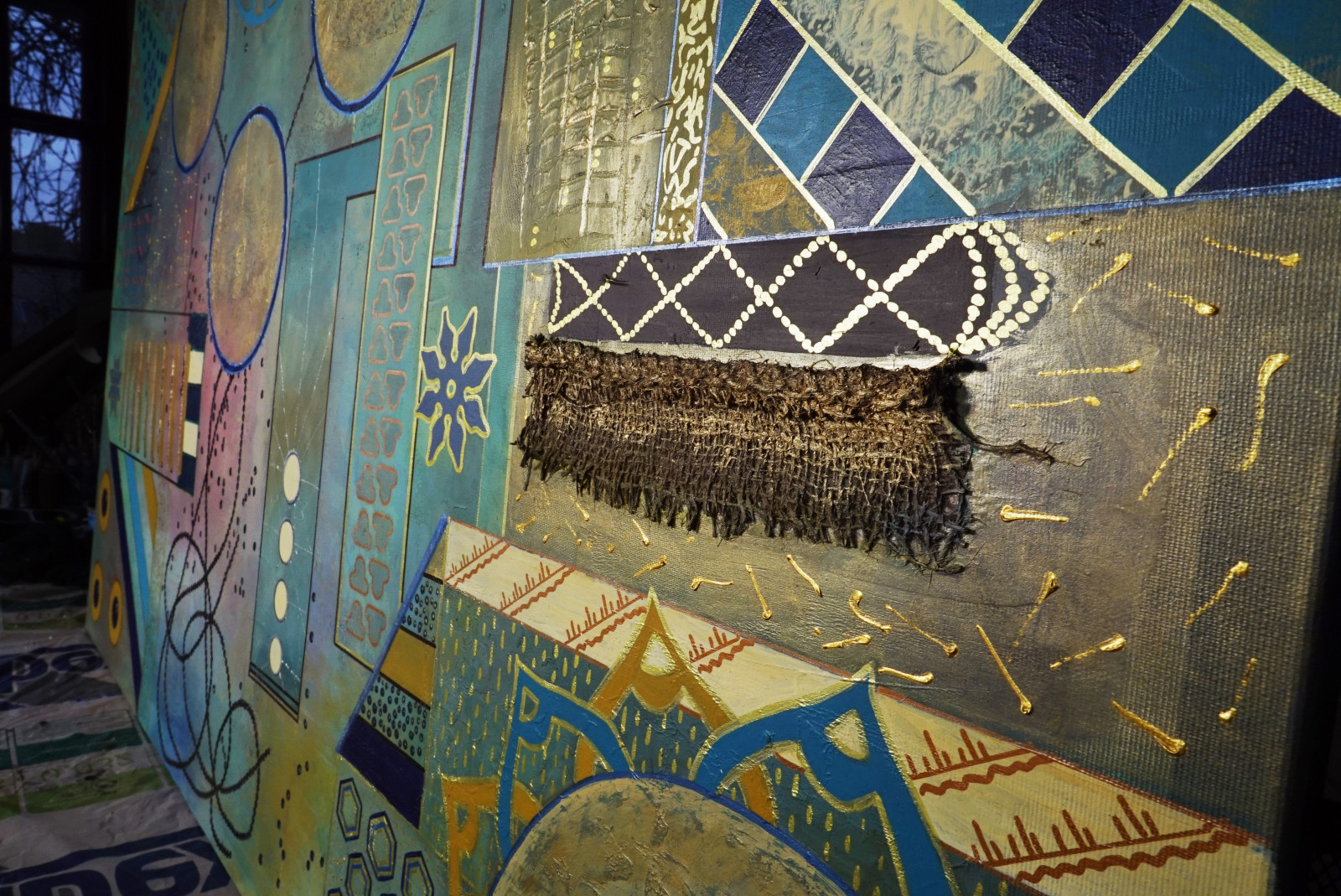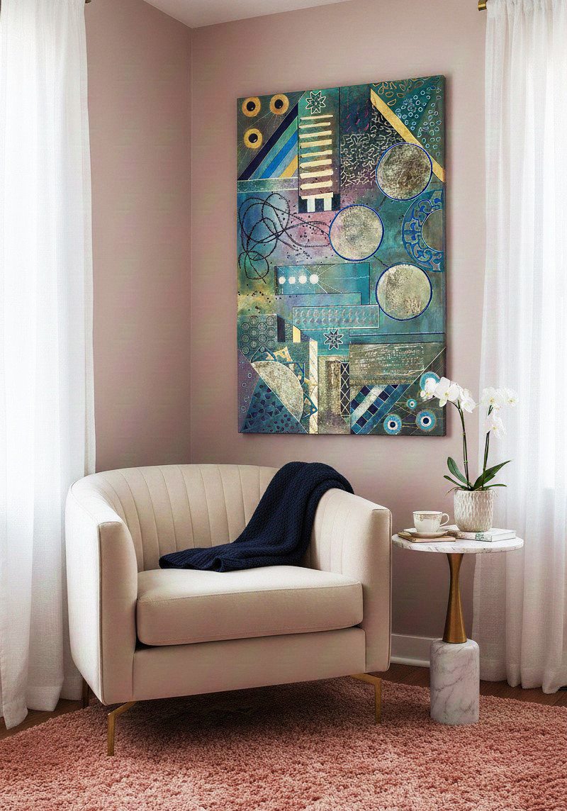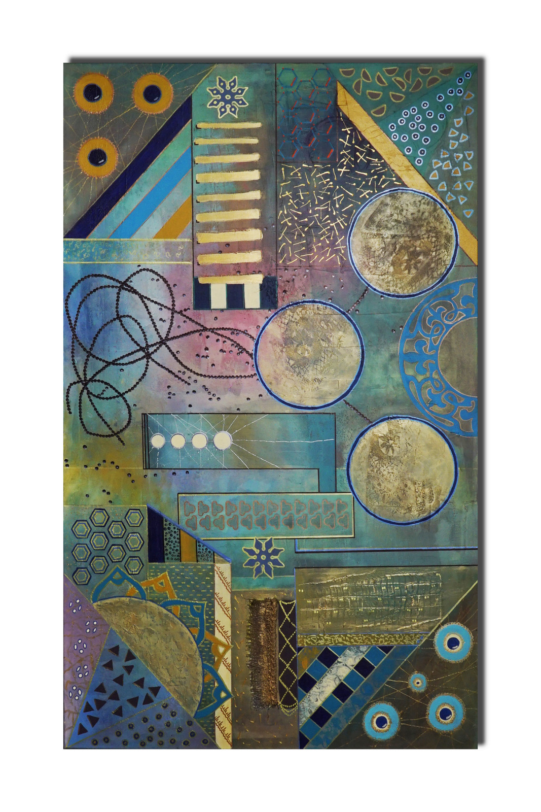 Geometria abstrakcyjna 7 - płótno 120 x 80 cm, mixed media, boki zamalowane na czarno. Obraz można powiesić w pionie jak i w poziomie.