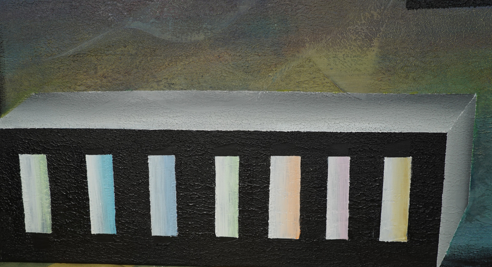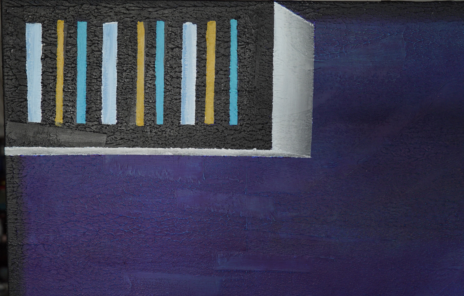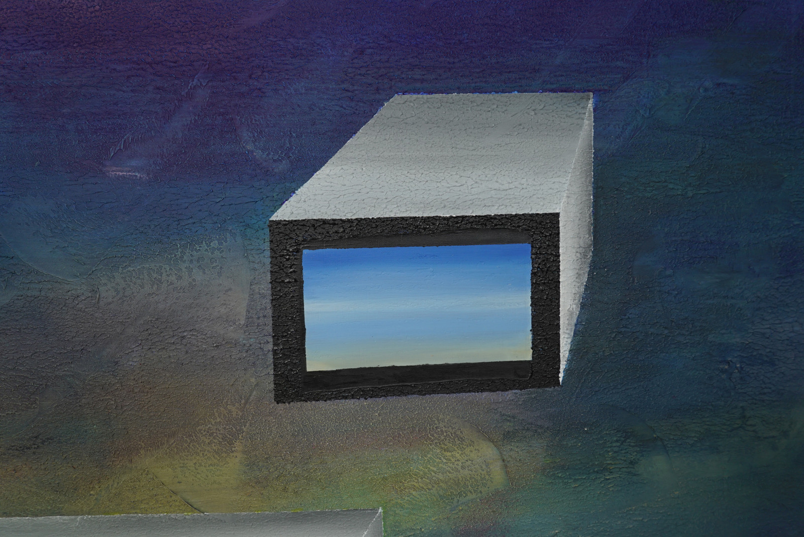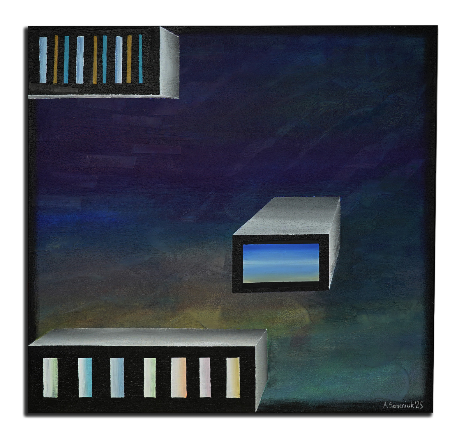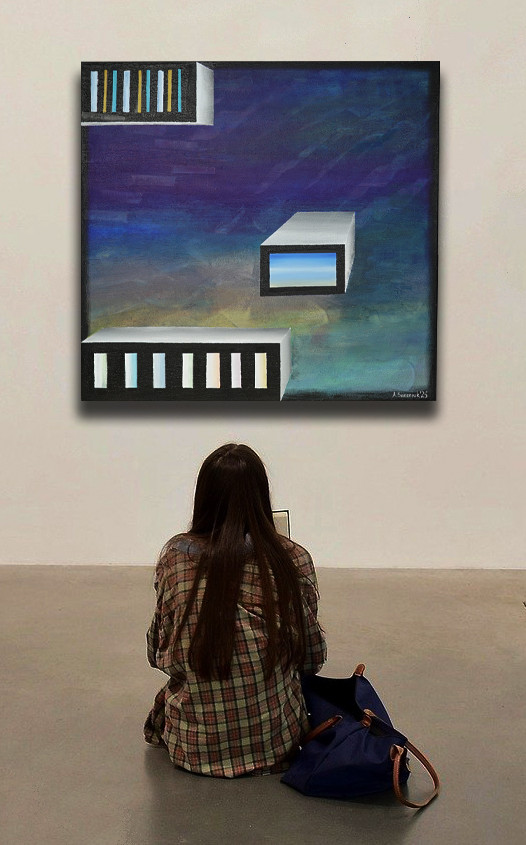 Komórki do wynajęcia - obraz z cyklu Wolna wypowiedź. Namalowany na płótnie 100 x 100 cm, mixed media, boki zamalowane, sygnatura w dolnym, prawym rogu.