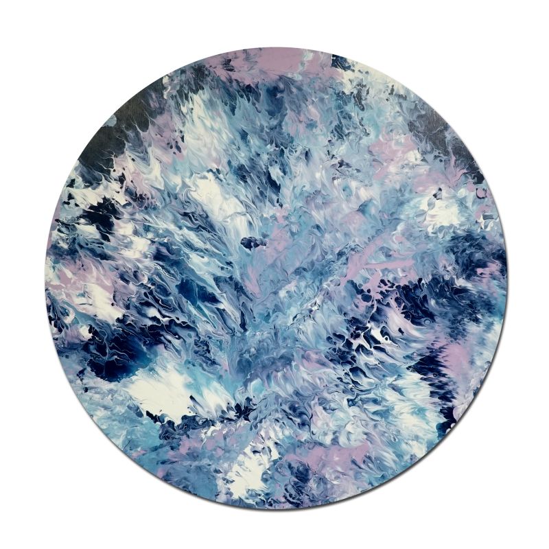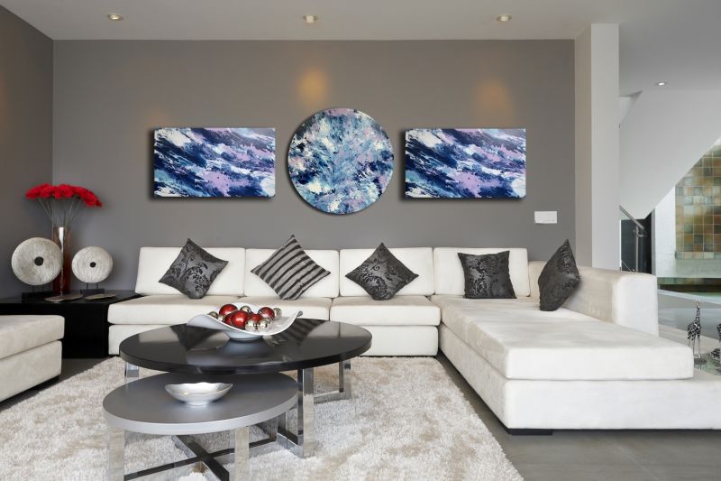 Kompozycja - tryptyk w cyklu Moje niebo składający się z dwóch obrazów malowanych na płótnie ( 70x40 cm) i jednego koła ze sklejki 6 mm o średnicy 60 cm. Farby akrylowe. Obrazy gotowe do zawieszenia. Zalecam zawieszenie na ścianie o minimalnej szerokości 2,5m.