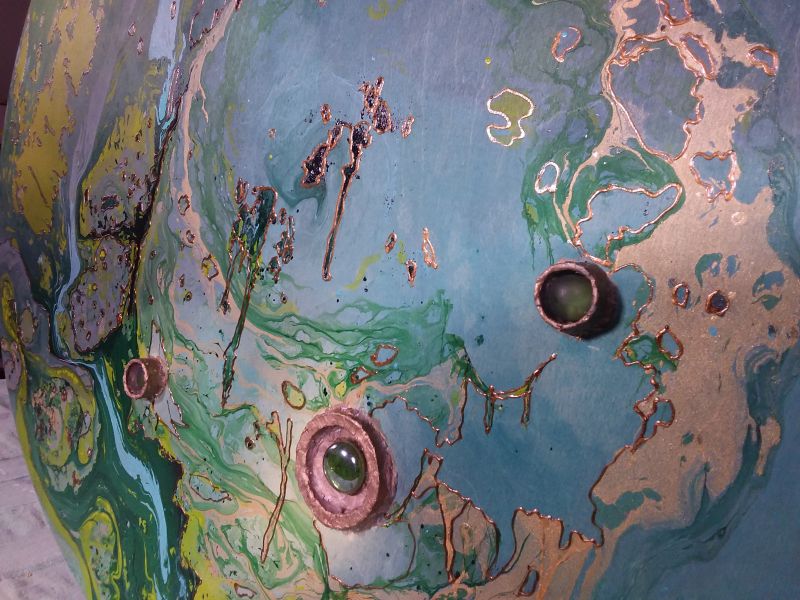 Obraz malowany techniką ebru oraz klasyczną z zastosowaniem farb olejnych, akrylowych, reliefów w kolorach metalicznych oraz sklejki o grubości 6mm. Kratery na obrazie wykonane metodą paper mache na konstrukcji z grubej, twardej tektury. Obraz sygnowany na odwrocie.