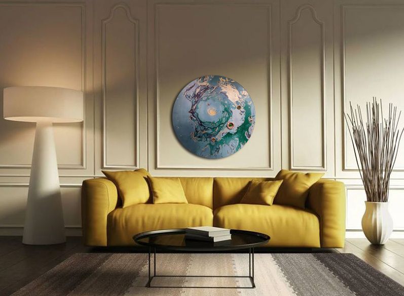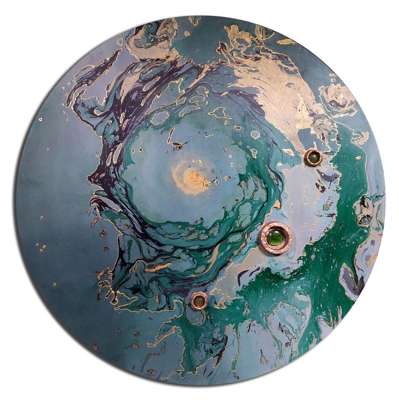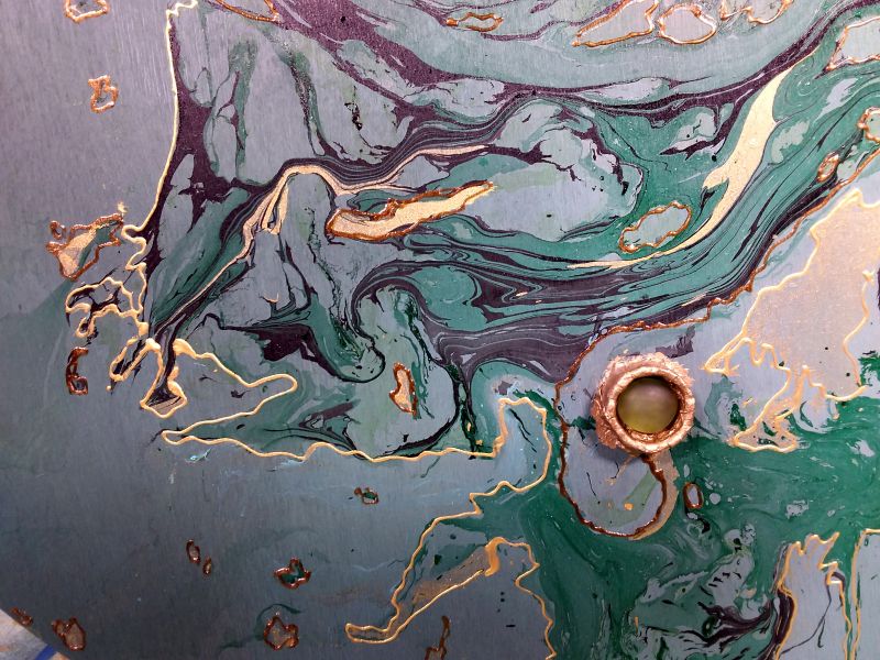 Obraz malowany techniką ebru oraz klasyczną z zastosowaniem farb olejnych, akrylowych, reliefów w kolorach metalicznych oraz sklejki o grubości 6mm. Kratery na obrazie wykonane metodą paper mache na konstrukcji z grubej, twardej tektury. Obraz sygnowany na odwrocie.