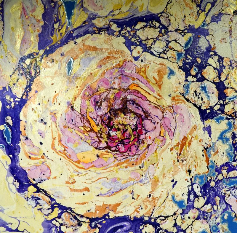 Obraz malowany techniką ebru oraz klasyczną z zastosowaniem farb olejnych, akrylowych, reliefu w kolorze srebrnym lub złotym oraz sklejki o grubości 6mm. Dominujące kolory to fiolet i złoto.