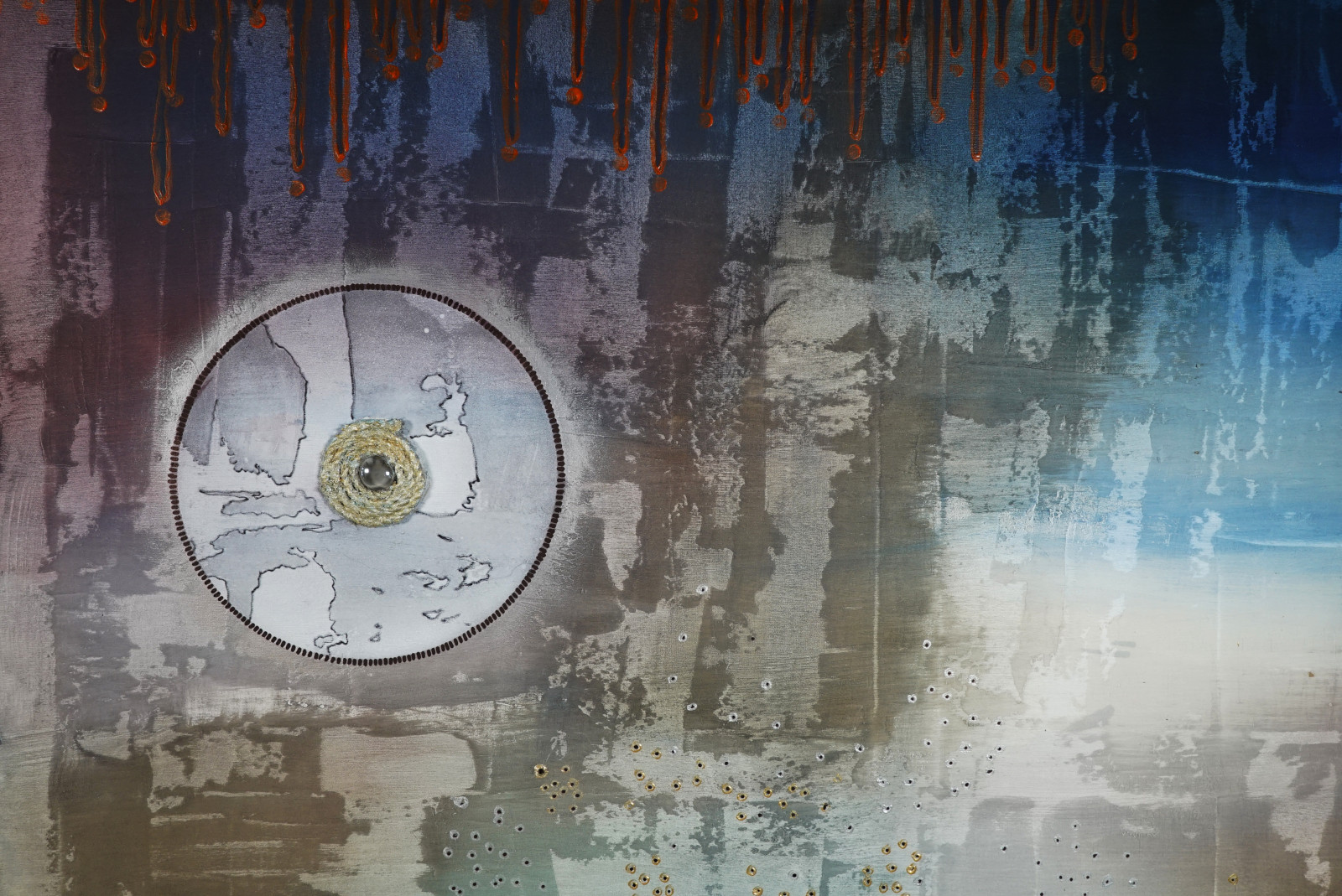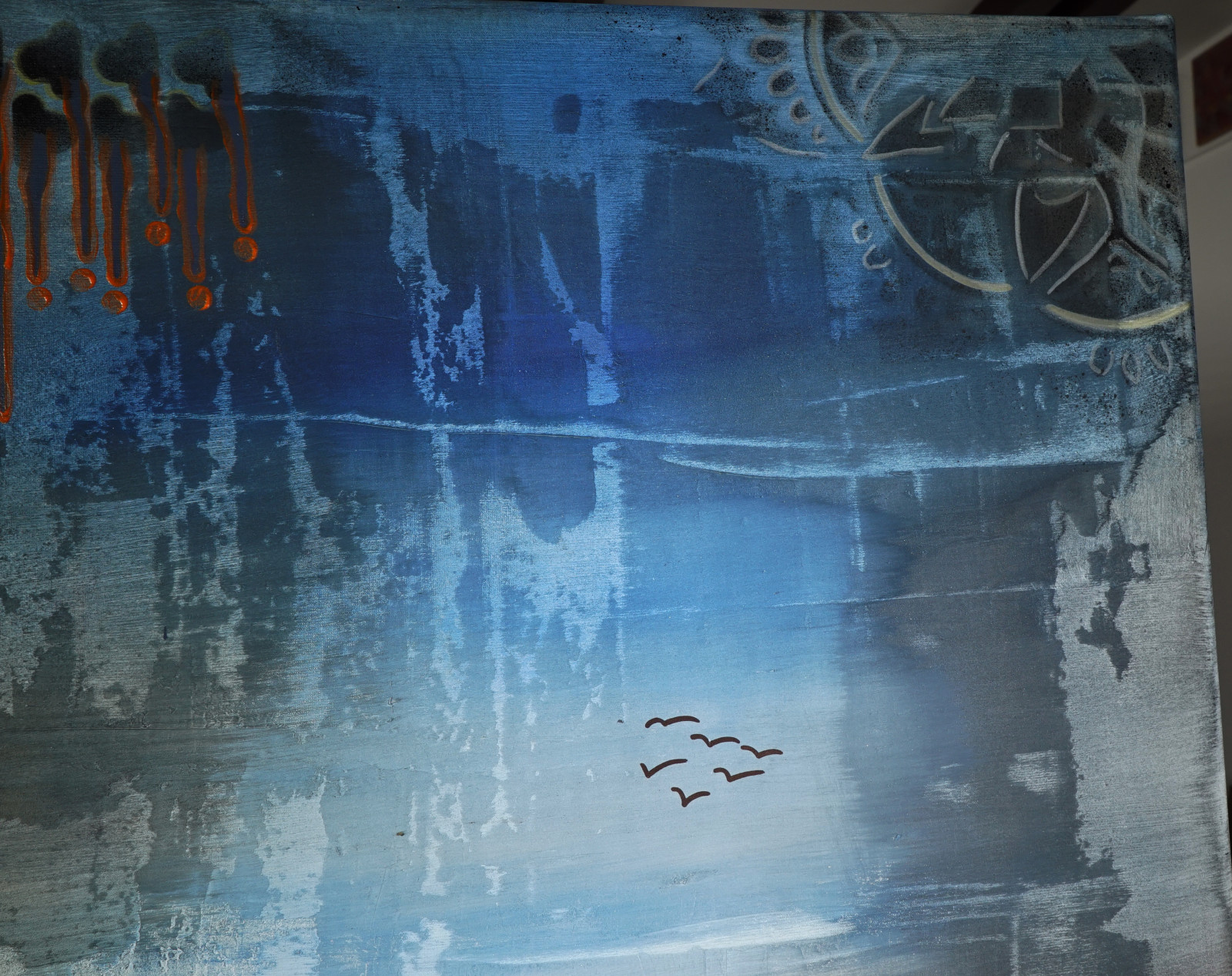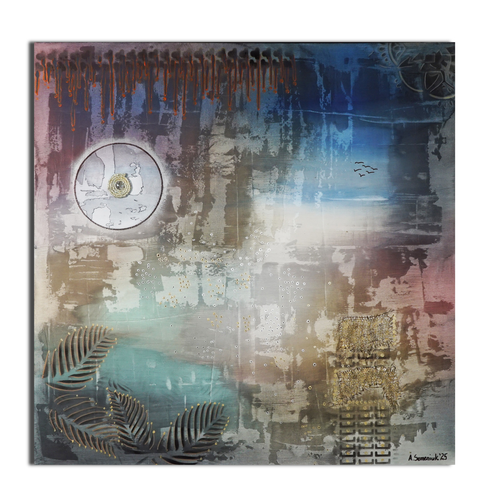 Okrąg w lewym górnym rogu przypomina stary zegar albo mapę nieznanego globu – coś, co już raz było, ale teraz pozostaje tylko echem. Delikatne sylwetki ptaków w oddali lecą ku przestrzeni, której nie da się zatrzymać. W prawym dolnym rogu – fragmenty tekstur, siatek, odciśniętych znaków – jakby zapisane ślady obecności, teraz już nieobecnej. Metaliczne liście to pozostałość, fizyczny ślad natury w tej abstrakcyjnej topografii.