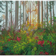 Obraz przedstawia ostatnie maliny rosnące jesienią w bieszczadzkim lesie.