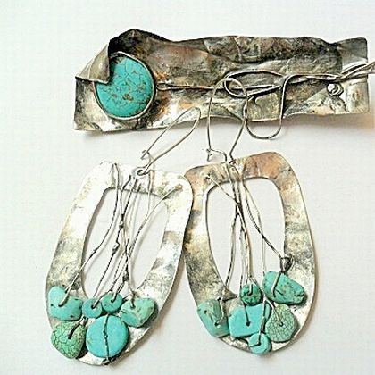 Kolczyki z matywem roslinnym.Miedz,cyna,howlity,turkusy.Bigle srebro z proba.