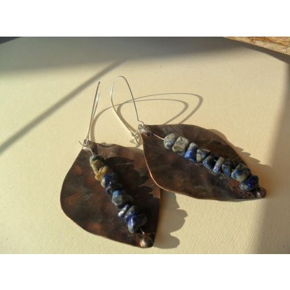 Oto kolczyki z dusza..miedziane z mnostwem granatowych howlitow.Wymiary ok.6 na 4cm,dluuugie bigle.Polecam!