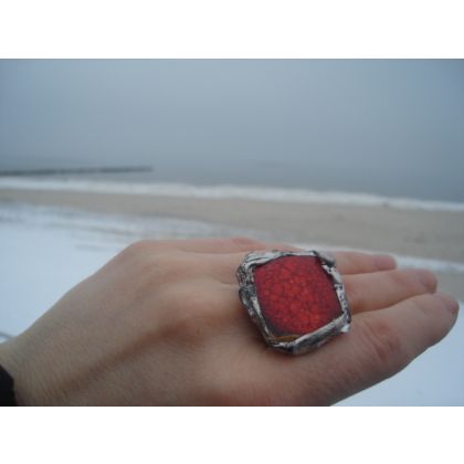 Oto ceramiczne,malinowe oczko oprawione w patynowana cyne.Srednica oka 2,5cm.Obraczka regulowana.Serdecznie polecam!