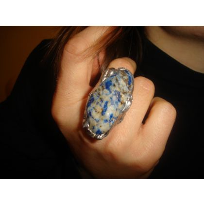 Oto wielki,4 cm. pierscien metaloplastyczny z cudownie malarskim okiem!Kamien jaspisu oprawiony w cyne,patynowany na stare srebro.Obraczka posrebzana,regulowana.Zapraszam do zakupu!