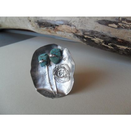Oto wystukany w miedzi pierscien..dwa kamyki howlitu tworza artystyczny bukiet.Wymiary tarczy ok.5 na 4cm,obraczka regulowana.Polecam!