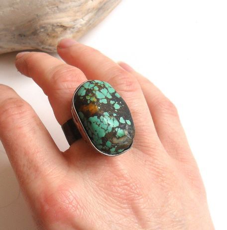 Pierścień z piękną bryłką turkusu oprawionego w miedz.Gruba,regulowana obrączka.Oczko ma ok.2,7cm.