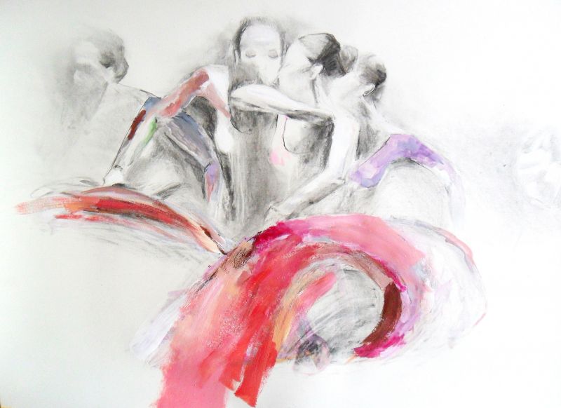 Rysunek węglem i akrylami w tonacji malinowej,100/70cm.Wysyłka prac w tubie.