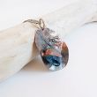 Wisior w ksztalcie "gniecionego" liscia z mlotkowanej,patynowanej na stare zloto miedzi i korala.Wymiary 6 na 4,5cm,lancuszek w komplecie.Polecam!