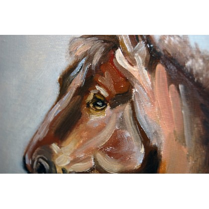 Obraz namalowano techniką olejną na bawełnianym płótnie (20/20/1,5 cm). Nieoprawiony zamalowane krawędzie boczne. Sygnowany i datowany z przodu. Dołączony certyfikat autentyczności. Całe płótno jest wypełnione dużą, blisko przedstawioną głową konia, która dominuje nad całą przestrzenią obrazu. Głowa konia jest przedstawiona w pełnym spokoju i majestacie. Jego piękna sierść o odcieniach brązu i czekolady delikatnie odbija światło, nadając mu głębię i trójwymiarowość. Muskuły konia są wyraziste i zarysowane, ukazując jego siłę i godność. Koń ma duże, czarne oczy, które wydają się patrzeć w nieskończoność. Spojrzenie jest głębokie i pełne mądrości, emanuje spokojem i zrozumieniem