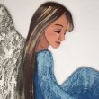 Anioł ręcznie malowany na drewnianej, dociętej do kształtu płycie. Wymiar ok. 52 cm x 40 cm x 5 mm. Można go umieścić na futrynie bądź ramie lustra czy półce z kantem. Widoczna faktura na skrzydłach i szacie. Doskonały prezent na dla bliskiej osoby. Sprawdzi się także w pokoju dziecięcym i młodzieżowym.