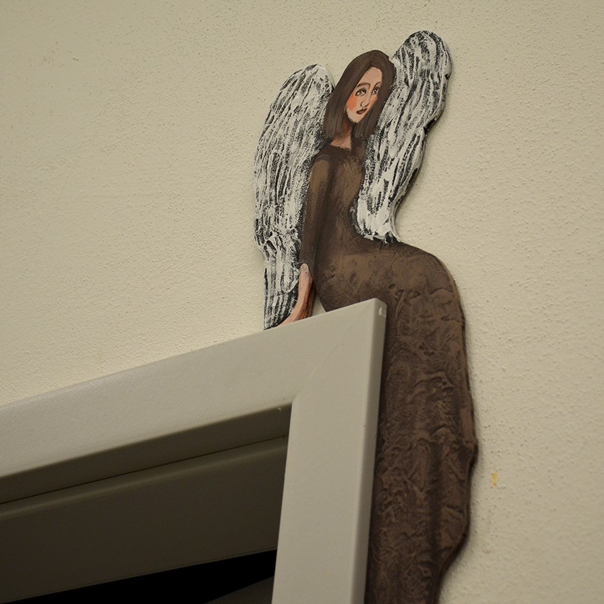 Anioł ręcznie malowany na drewnianej, dociętej do kształtu płycie. Wymiar ok. 50 cm x 19 cm x 5 mm. Można go umieścić na futrynie bądź ramie lustra czy półce z kantem. Widoczna faktura na skrzydłach i szacie. Doskonały prezent na dla bliskiej osoby