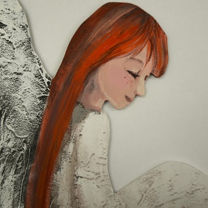 Anioł ręcznie malowany na drewnianej, dociętej do kształtu płycie. Wymiar ok. 52 cm x 40 cm x 6 mm. Można go umieścić na futrynie bądź ramie lustra czy półce z kantem. Widoczna faktura na skrzydłach i szacie. Doskonały prezent na dla bliskiej osoby. Sprawdzi się także w pokoju dziecięcym i młodzieżowym.