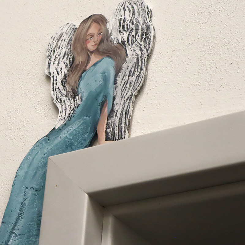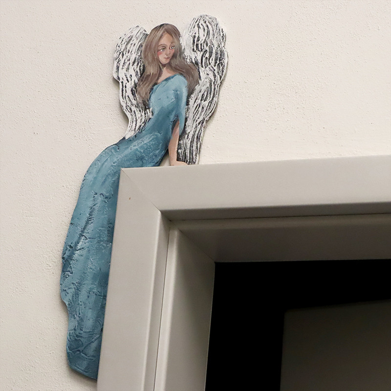 Anioł ręcznie malowany na drewnianej, dociętej do kształtu płycie. Wymiar ok. 50 cm x 19 cm x 5 mm. Można go umieścić na futrynie bądź ramie lustra czy półce z kantem. Widoczna faktura na skrzydłach i szacie. Doskonały prezent na dla bliskiej osoby