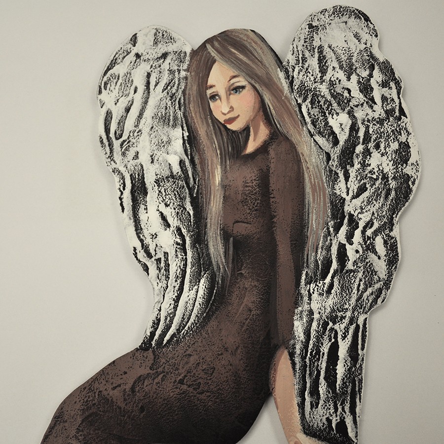 Anioł ręcznie malowany na drewnianej, dociętej do kształtu płycie. Wymiar ok. 50 cm x 19 cm x 6 mm. Można go umieścić na futrynie bądź ramie lustra czy półce z kantem. Widoczna faktura na skrzydłach i szacie. Doskonały prezent na dla bliskiej osoby.