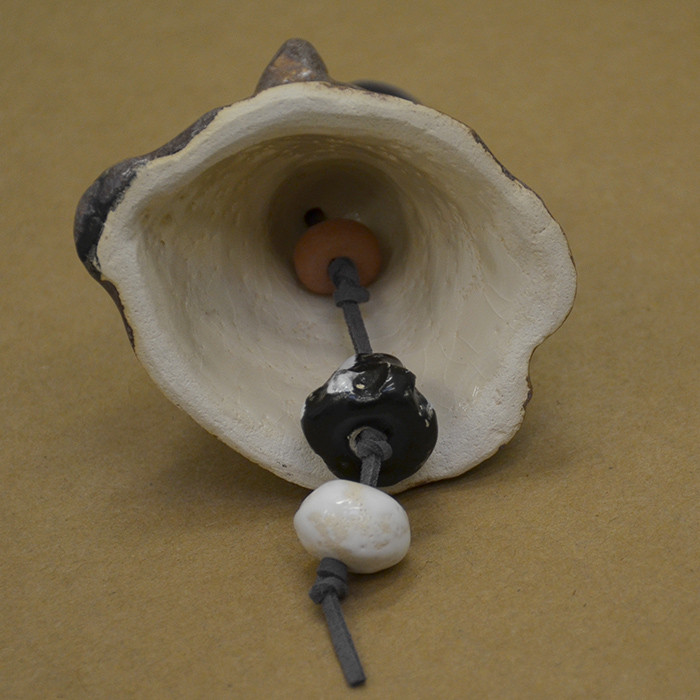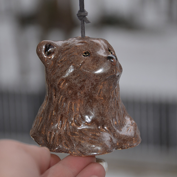 Mały niedźwiadek lub słodki miś, jak kto woli.... Ręcznie formowany dzwonek, szkliwiony i dwukrotnie wypalany w piecu w temp. 1080 stopni C. Kolor szkliw: czarne, brązowe efekt, biel. Pod spodem szkliwo przeźroczyste z efektem spękania. Wymiary: wysokość (nie licząc rzemienia i zawieszek ok 8 cm, średnica ok 7 cm. Dzwoneczek jest jedyny w swoim rodzaju i niepowtarzalny. Dzwoni naprawdę głośno.
