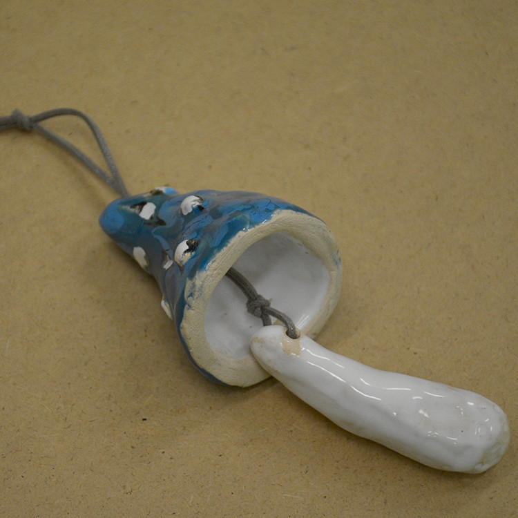 Ręcznie formowany dzwonek, szkliwiony i dwukrotnie wypalana w piecu w temp. 1080 stopni C. Kolor szkliw: białe, niebieskie i turkusowe. Wymiary w zawieszeniu: wysokość (nie licząc rzemienia i zawieszek ok 12 cm, średnica ok 6 cm. Dzwoneczek głośno dzwoni. Dla grzybiarzy i marzycieli jako figlarny prezent.
