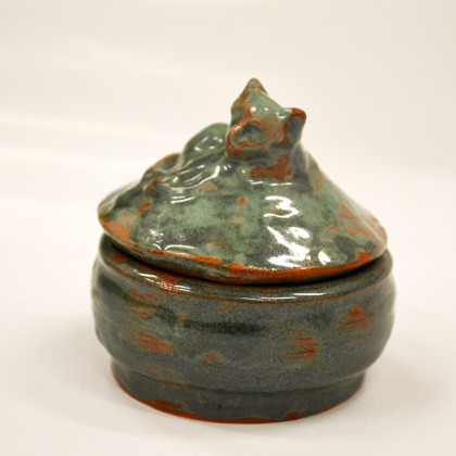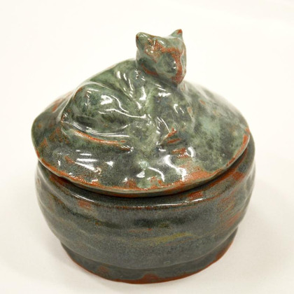 Toczona na kole miseczka ceramiczna z ręcznie lepioną przykrywką. Przykrywka zdobiona leżącym kotkiem, który stanowi także uchwyt. Średnica 9 cm, wysokość 4 cm / 9 cm z pokrywką. Szkliwo do kontaktu z żywnością suchą. Ceramika artystyczna, dwukrotnie wypalana w piecu ceramicznym, szkliwiona. Może być szkatułką na skarby- biżuterię lub łakocie, może pełnić funkcję cukierniczki itp.... Super prezent, oryginalny dekor