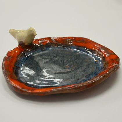Ptaszyna, talerz handmade na łakocie lub biżuterię i drobiazgi. Ręcznie formowany talerz z gliny szamotowej. Szkliwiony i dwukrotnie wypalany w piecu w temp. 1080 stopni C. Gdzieniegdzie przebija się surowa, wypalona glina. Wymiary: ok. 20cm (z ogonem) x 14,5 cm (średnica talerzyka) wys. do ok.6,5 cm (wliczając ptaka). Pokryty szkliwem spożywczym przeznaczonym do kontaktu z żywnością suchą. Mycie ręczne. Nie nadaje się do mycia w zmywarce. Ciekawa i oryginalna ozdoba.