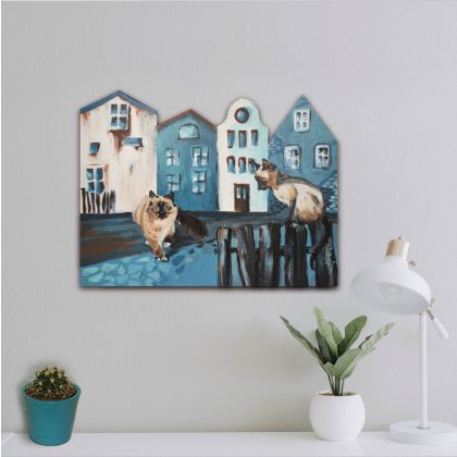 Obraz akrylowy +technika własna na płycie MDF dociętej do odpowiedniego kształtu. Boki zamalowane. Zabezpieczony lakierem z połyskiem. Obraz dla miłośników kotów, ale nie tylko. Pasuje do różnego rodzaju i stylu wnętrz.