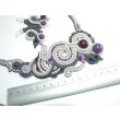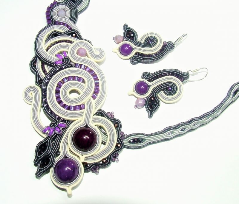 Komplet biżuterii sutasz, czyli kolia i kolczyki. Całość wykonana ręcznie niezwykle efektowną metodą haftu sutasz. Uszyta jest z wysokiej jakości wiskozowych sznurków oraz kamieni naturalnych otoczonych japońskimi, szklanymi koralikami TOHO. Kolczyki zawieszone są na srebrnych( pr. 925) biglach otwartych. Naszyjnik ma zapięcie typu sutasz z możliwością czterostopniowej regulacji.