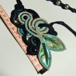 Asymetryczny naszyjnik wykonany w całości ręcznie metodą haftu sutasz. Uszyty jest z turkusowych, kremowych i czarnych sznurków wiskozowych czeskiej firmy PEGA. Sercem naszyjnika są turkusowe liście z masy perłowej oraz czarna perła firmy Swarovski. Całość została otoczona japońskimi koralikami TOHO.