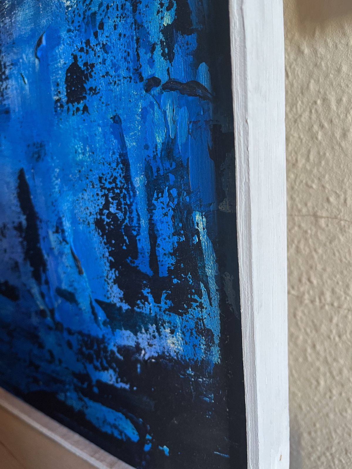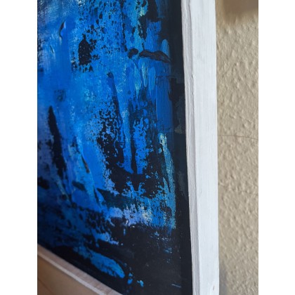Obraz to abstrakcja intuicyjna w odcieniach ciemnych i chłodnych. Farby nakładane szpachlami o różnej fakturze.