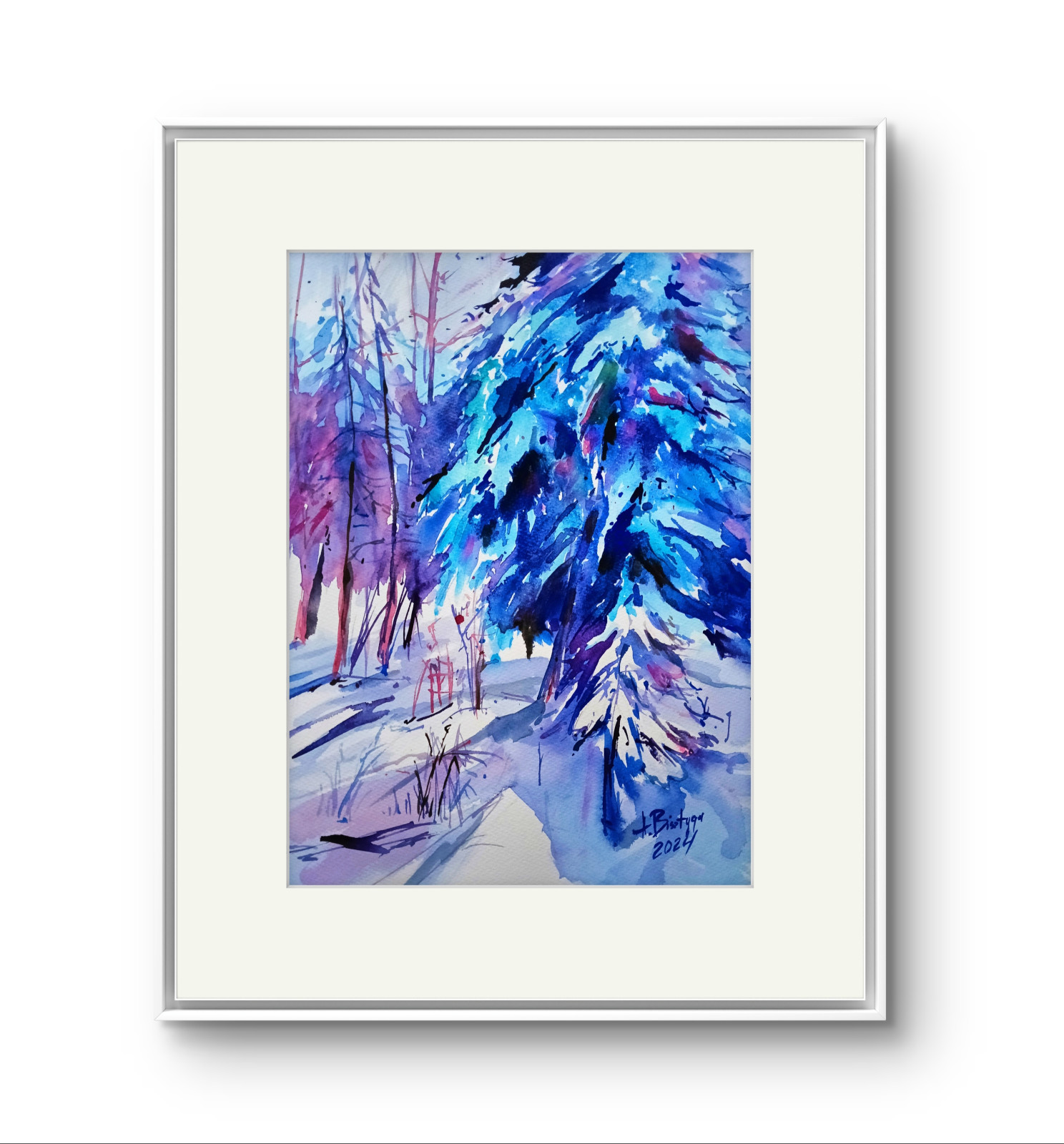 Akwarela namalowana na wysokiej jakości bezkwasowym papierze akwarelowym FABRIANO WATERCOLOUR 300 GSM, farbami Roman Szmal Aquarius oraz Daniel Smith, sygnowana, oprawiona w passe-partout w kolorze białym lub eqri. Bez ramy. Praca z cyklu Zima pełna koloru.