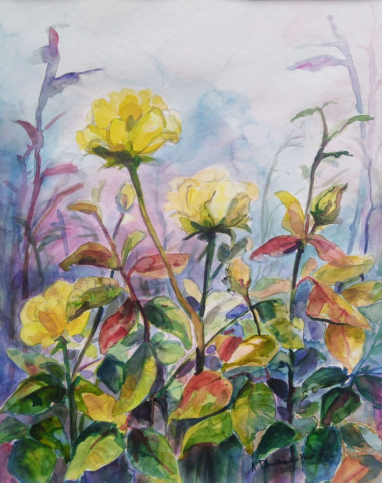 Duża akwarela, namalowana na wysokiej jakości papierze akwarelowym GAMMA FABRIANO WATERCOLOUR 300 GSM, farbami Roman Szmal Aquarius, sygnowana z przodu, oprawiona w passe-partout w kolorze białym. Data powstania 2021r.