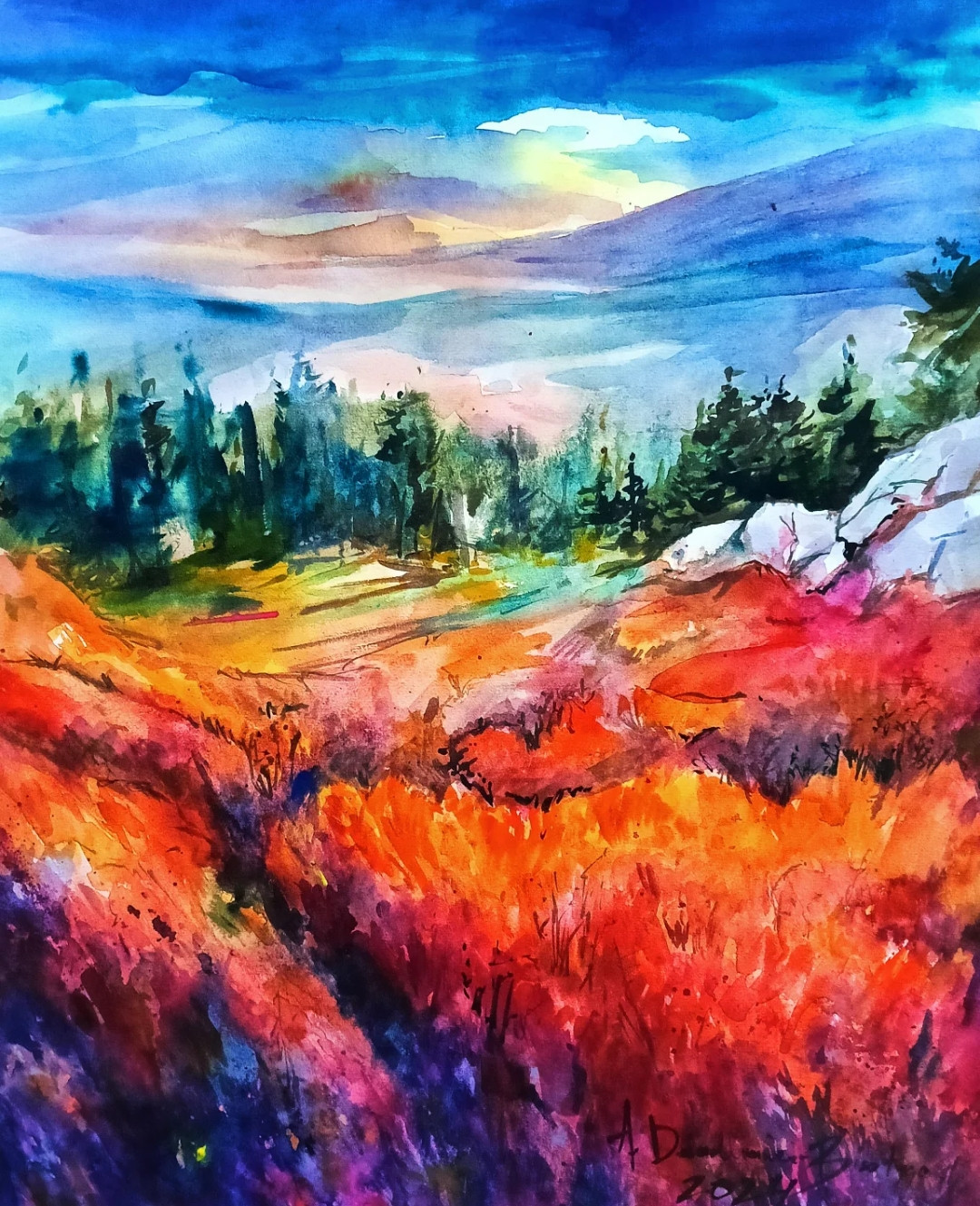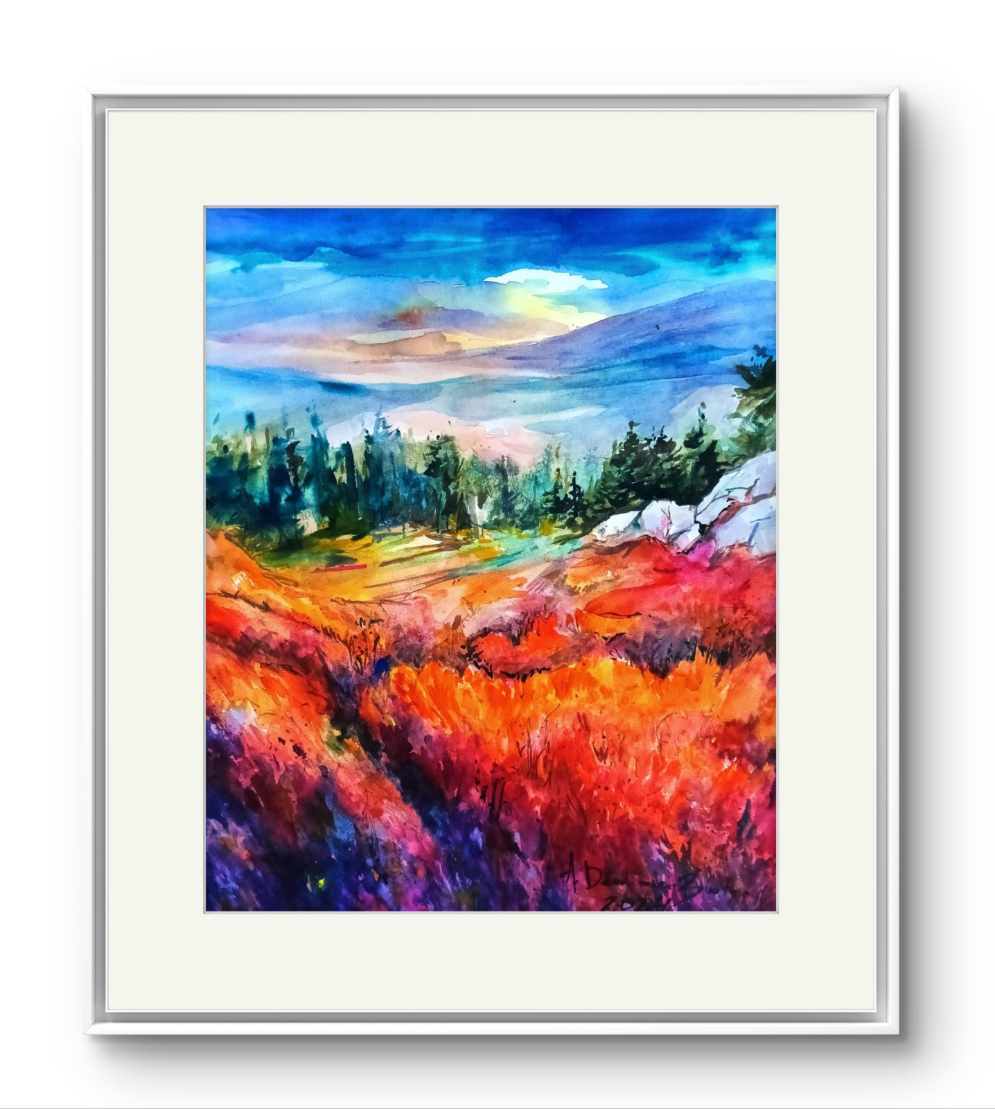 Duża akwarela, namalowana na wysokiej jakości papierze akwarelowym 100% bawełna, FABRIANO WATERCOLOUR 300 GSM, farbami Roman Szmal Aquarius oraz Daniel Smith, sygnowana, oprawiona w passe-partout w kolorze białym lub ecru. Rok powstania 2025. Praca bez ramy.